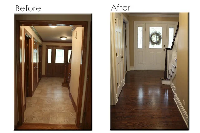 Take for example this foyer belonging to Liz of Decorating the Ville. By painting all the brown trim and doors white, it instantly brightened up the foyer and transformed it from the 70's to classic.