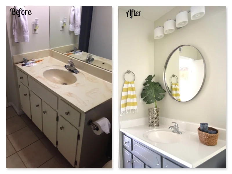 As a temporary fix, I painted my guest bathroom cabinet which you can read more about it here.