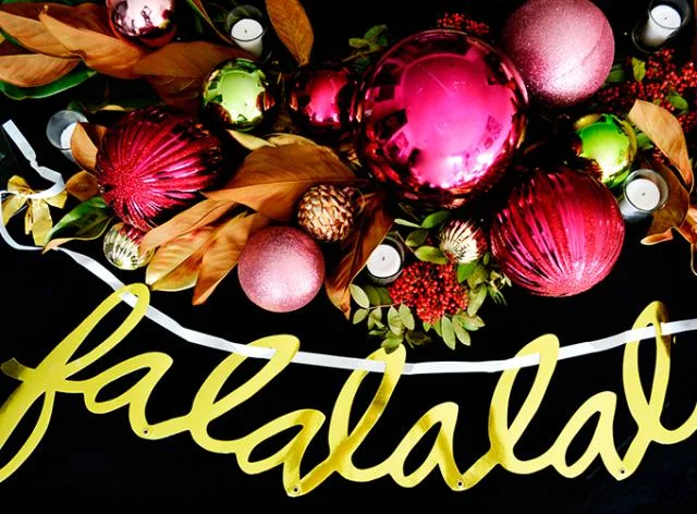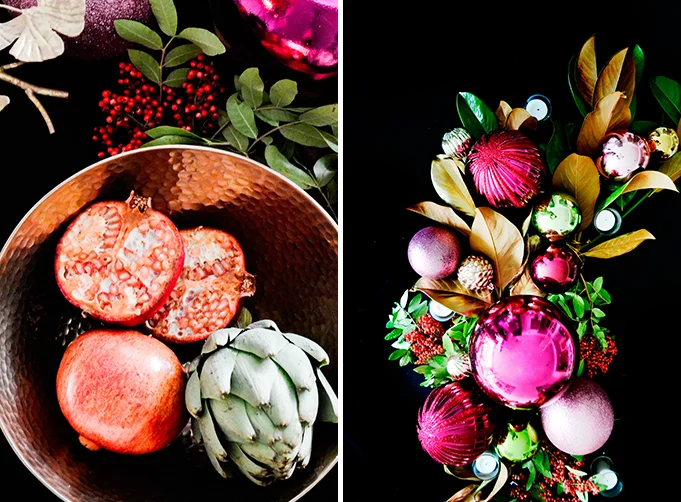 I absolutely love this tablescape designed by Camile Simmons. Her palette choice of berry and green is a fresh update to the typical Christmas colors. Set against a dark table, the colors really pop. It reminds me of an Ashley Woodson Bailey print. The pomegranate and artichoke are a nice unexpected touch. Both naturally are beautiful in color and structure. The brown from the magnolia leaves help to tone down the strong pink ornaments. Camile also has some great hosting tips which you can read here.