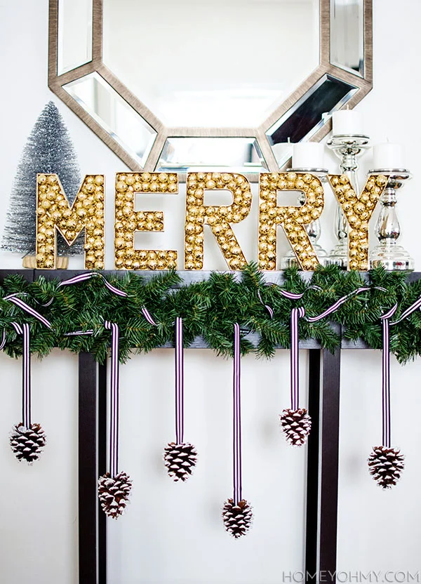 This DIY Marquee by Homey Oh My could easily be adapted into a table center piece. Instead of hanging the pine cones like she has, they can be bow tied closer to the branches and laid across a table. Click here for the DIY instructions.
