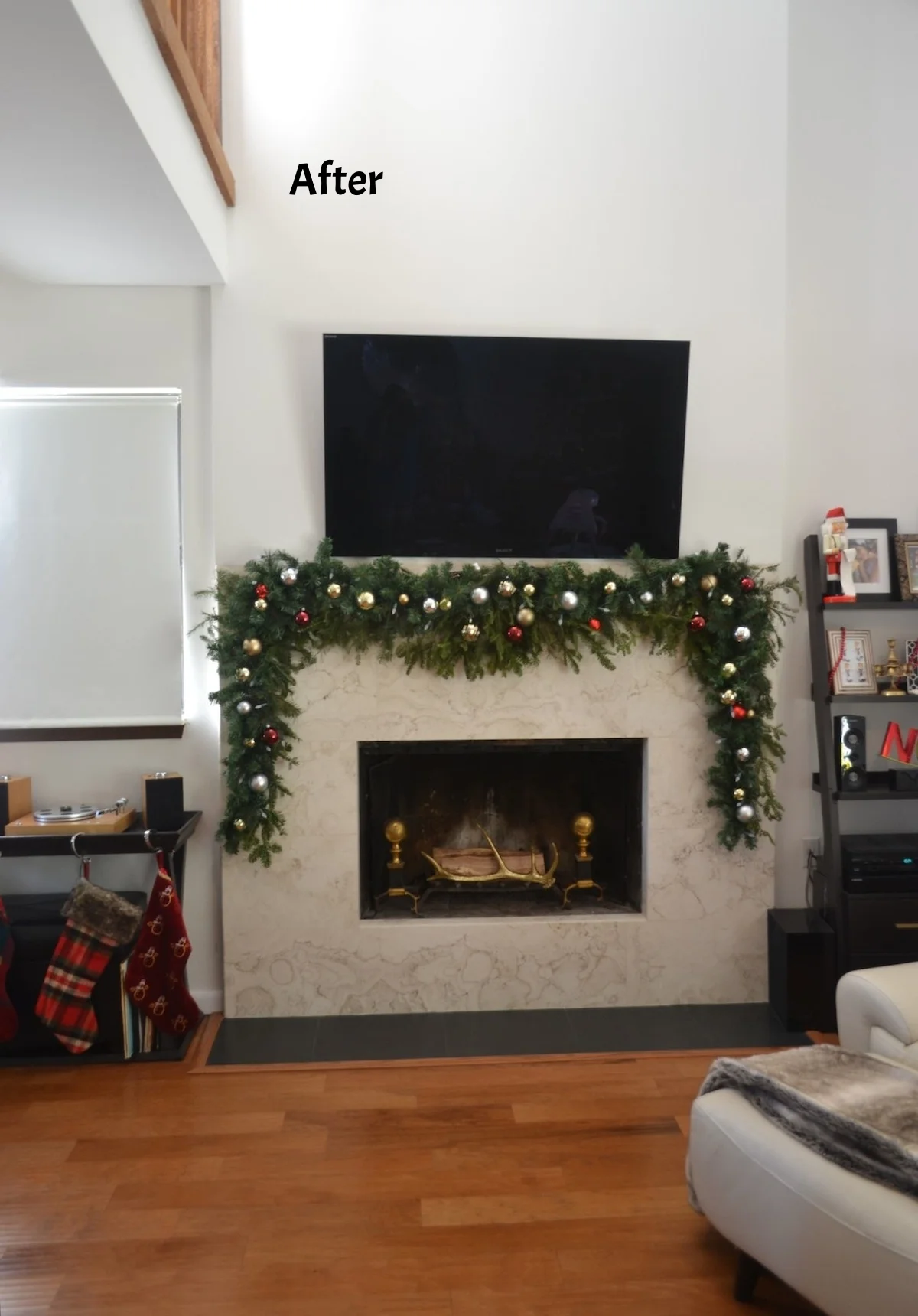An update to my garland post. My nursery was out of fresh garland so I grabbed an armful of free clippings out of their bin and purchased a couple artificial garlands from Target. I hung the garland with 3M hooks onto my mantel-less fireplace and then tucked the clippings into to the artificial garland. By the way, 3M hooks are awesome!