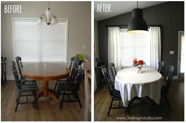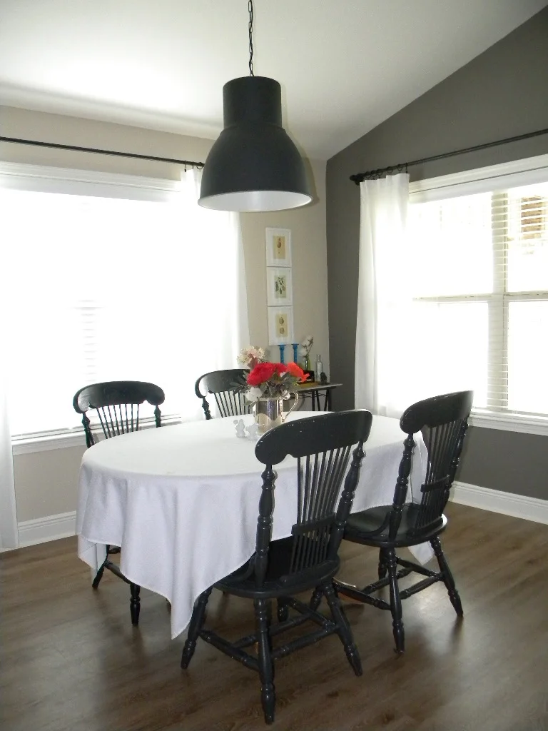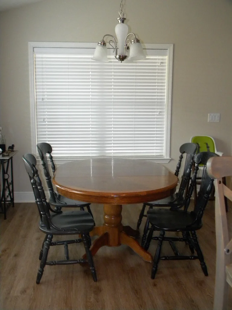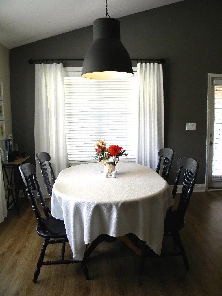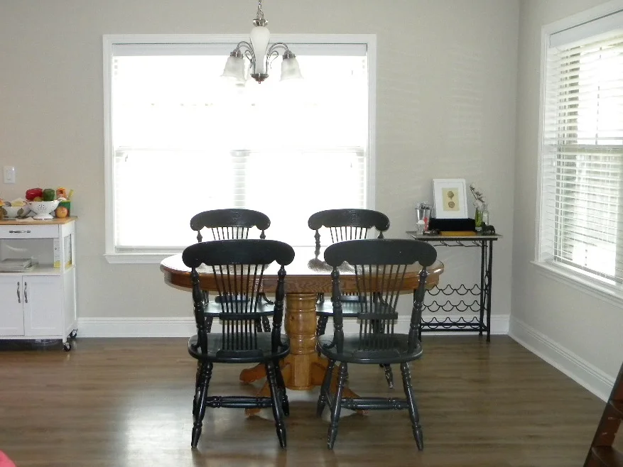 This was my breakfast nook shortly after we moved in. The table and chairs were my mom's (I ate from that table for as long as I can remember, and if you're a kid of the 80s/90s you probably had a similar one). In our old house I had the leaf removed and a colorful boho-looking tablecloth over it. I painted the chairs a dark charcoal several years ago. I had intentions of painting the table, but since all 4 chairs barely made it into the "completed" stages of being painted, I didn't want the table to endure the same suffering.