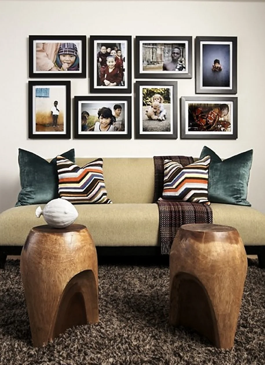 While this is a great photo arrangement, step away from your screen a few feet (come on, just do it). What do you see? If you say "a blob of black" you'd be right. Thick black frames (or even ones in a dark wood finish) tend to distract from the artwork. They also stand out really strongly from neutral walls. If you pick neutral frames and place them on a neutral wall, you'll be able to see the artwork for what it is.