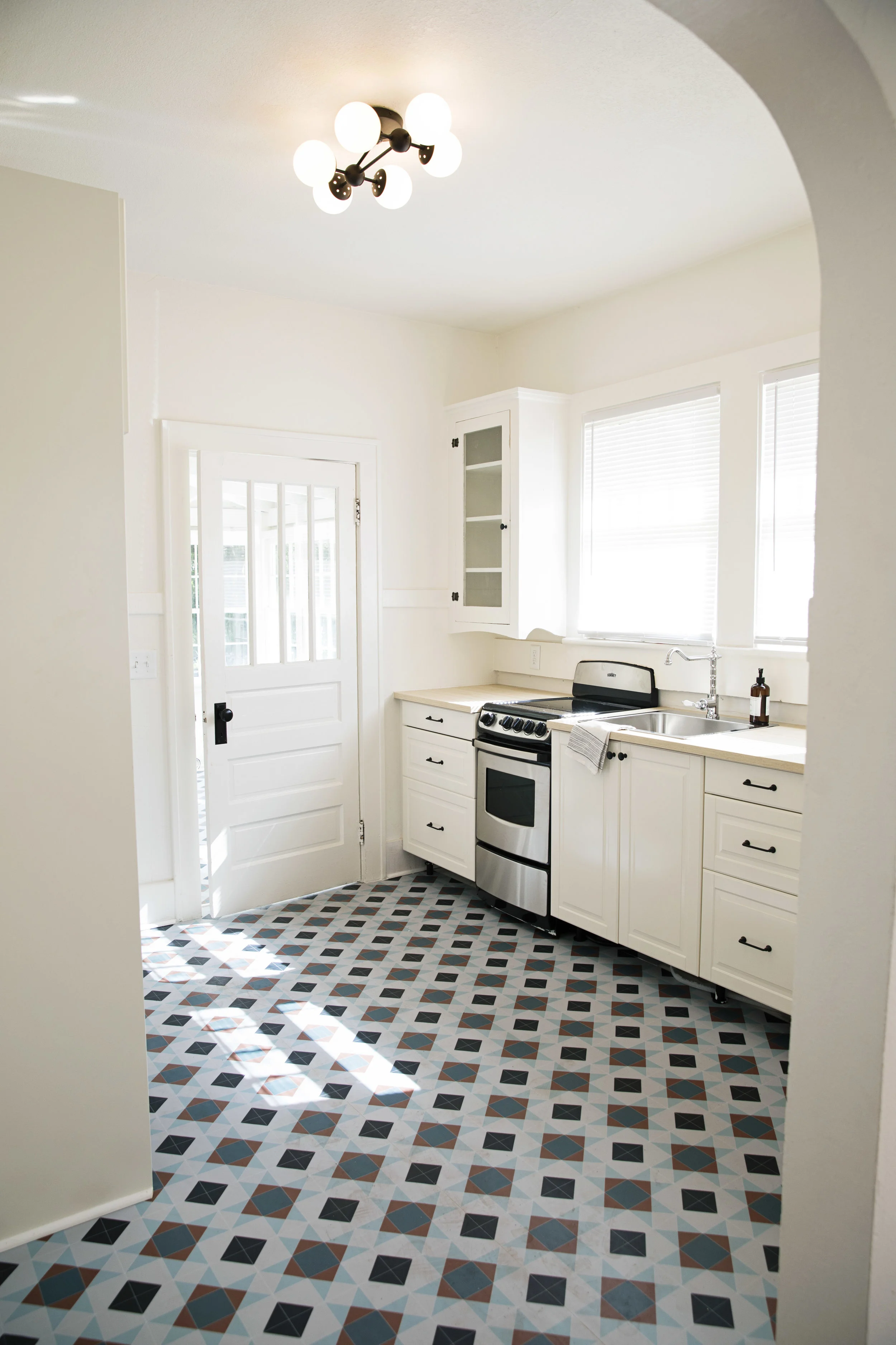 We continued to mix the house’s original pieces with new ones while working in the kitchen. Ikea Bodbyn cabinets were used for the lower cabinets while the original cabinets were kept for the uppers. Both the upper cabinets and walls were painted Valspar’s Soft Wool to blend in with the Bodbyn’s warmer white finish. Keeping the same theme throughout, we again mixed the finishes and found a cool light fixture to modernize this old space. To top off the space, we went with Atrafloor luxury vinyl from England in a fun, vintage print for both the kitchen and the connecting laundry room. Both the pattern and color brought a breathe of fresh air to the previously neglected spaces.