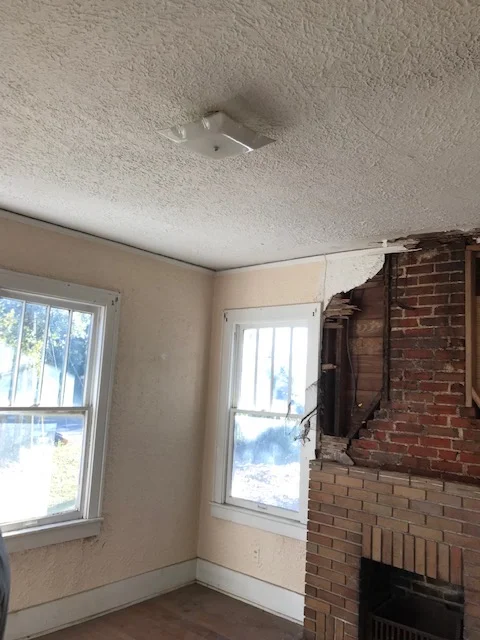 The living room was the last big room to need some major revival. The wall above the fireplace was ripped off and needing great repair. Matching the original plaster texture would have been difficult and not added any character to this charming home.